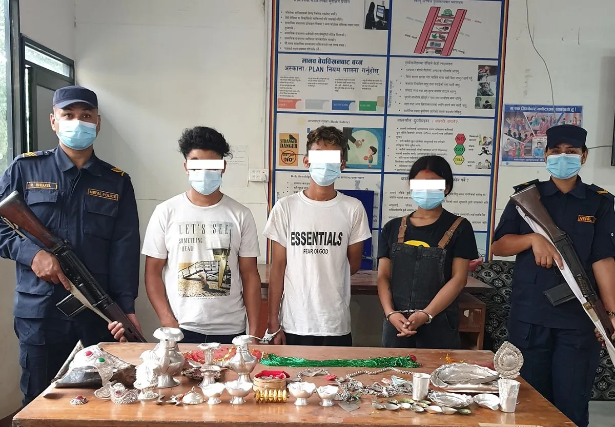 नक्साल नागपोखरीस्थित सन्तोषी माताको मूर्तिमा जडित सुनचाँदीको गहना चोरीमा संलग्न रहेको अभियोगमा ३ जनालाई प्रहरीले पक्राउ गरेको छ ।