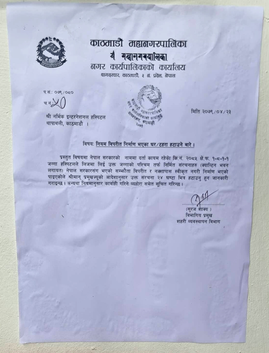 नर्भिक हस्पिटललाई काठमाडौं महानगरपालिकाले नियमविपरीत बनाएका संरचना हटाउन २४ घण्टे अल्टिमेटम दिएको छ।