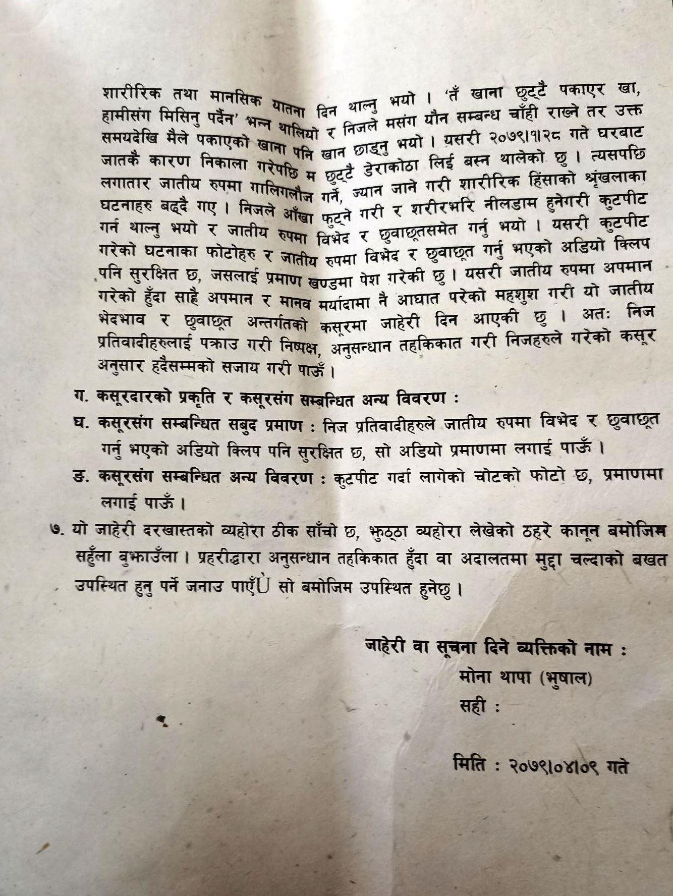 मोनाले श्रीमान अनुपम भुसाल, कान्छो ससुरा मोहन भुसाल, कान्छी सासु सिता भुसाल, जेठाजु सुमन भुसाल र पवन भुसाल, जेठानी दिया भुसाल र केशरी भुसालले आफूमाथि निरन्तर जातीय विभेद गरेको भन्दै जाहेरी दर्ता गराएकी हुन् । साउन ९ गतेदेखि २५ गतेसम्म १७ दिनको निरन्तर संघर्षपछि वुधबार जाहेरी दर्ता भएको हो ।