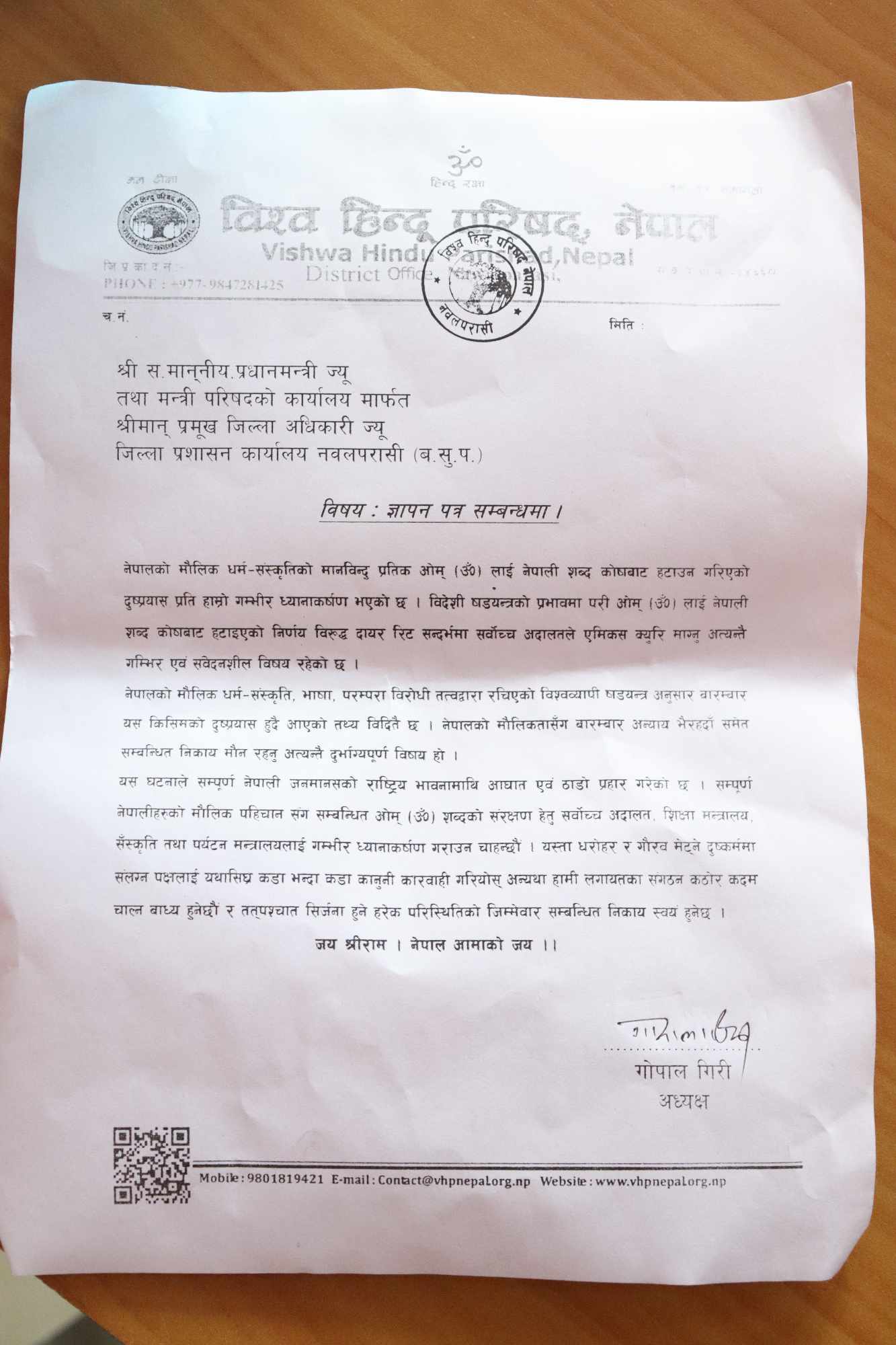 विश्व हिन्दु परिषद नेपाल पश्चिम नवलपरासी जिल्ला कार्य समितिले नेपाली शब्दकोषबाट ‘ॐ’ हटाउने कार्यलाई रोक्न प्रमूख जिल्ला अधिकारी मार्फत प्रधानमन्त्रीलाई ज्ञापन पत्र बुझाएका छन्।